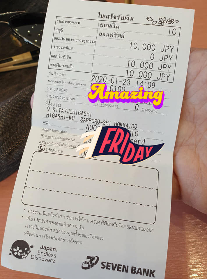 ถ้าเป็นตู้ของแบงค์อื่นๆ ผมไม่รู้นะ อันนี้ผมมาบอกตู้ของ seven bank ตอนที่ผมใช้ที่ sapporo เท่านั้น เพิ่งเคยใช้บัตรนี้ครั้งแรกที่นี่แหละ 5555