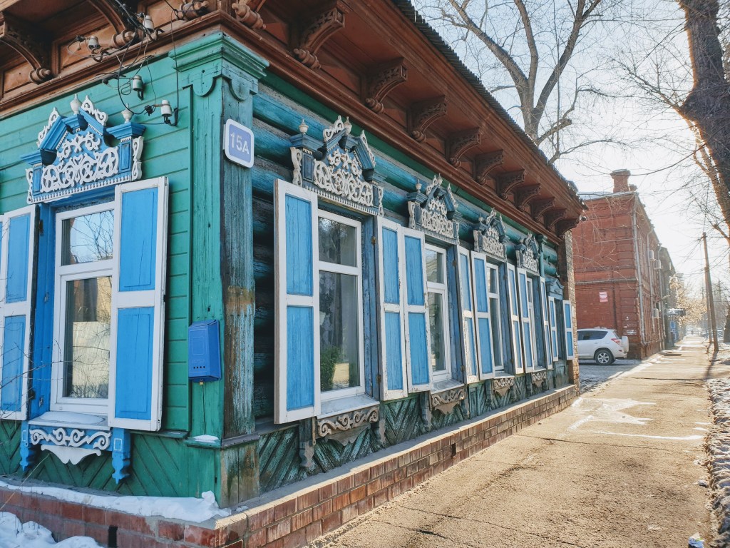 บ้านเรือนดั้งเดิมในเมืองอีร์คุตสค์แห่งนี้เค้าจะมีสถาปัตยกรรมไม้ที่เก่าแก่และสวยงาม โดยนิยมทาสีหน้าต่างด้วยสีขาว สีฟ้า หรือสีเขียว ซึ่งสะท้อนความเชื่อของชาวไซบีเรียน มีความเชื่อว่าการทาสีบ้านด้วย สีขาวหมายถึงความบริสุทธิ์ สีฟ้าหมายถึงความหวัง สีเขียวหมายถึงความเจริญรุ่งเรืองและมีอายุยืนยาว ซึ่งความหมายโดยรวมของการทาสีต่างๆก็ล้วนมีความหมายเพื่อการปกป้องบ้านแต่ละหลังเพื่อที่จะให้มีแต่ความโชคดีและไม่มีปัญหาอุปสรรคใดๆ ครับ เป็นสิ่งปลูกสร้างที่มีความสวยงามอย่างมีสไตล์ครับ ตรงนี้เป็นแหล่งรวมนักท่องเที่ยวจริงๆ ครับ เพราะทุกอย่างแพงหมด มากิน มาเดินเล่นถ่ายรูปก็พอแล้วเด้ออออ