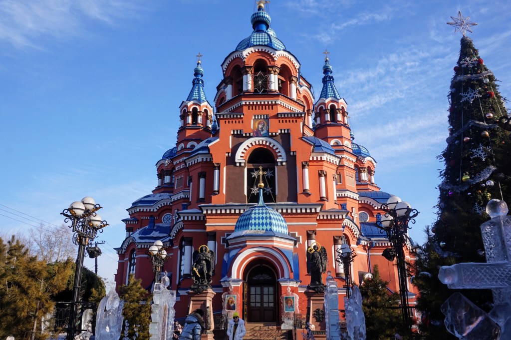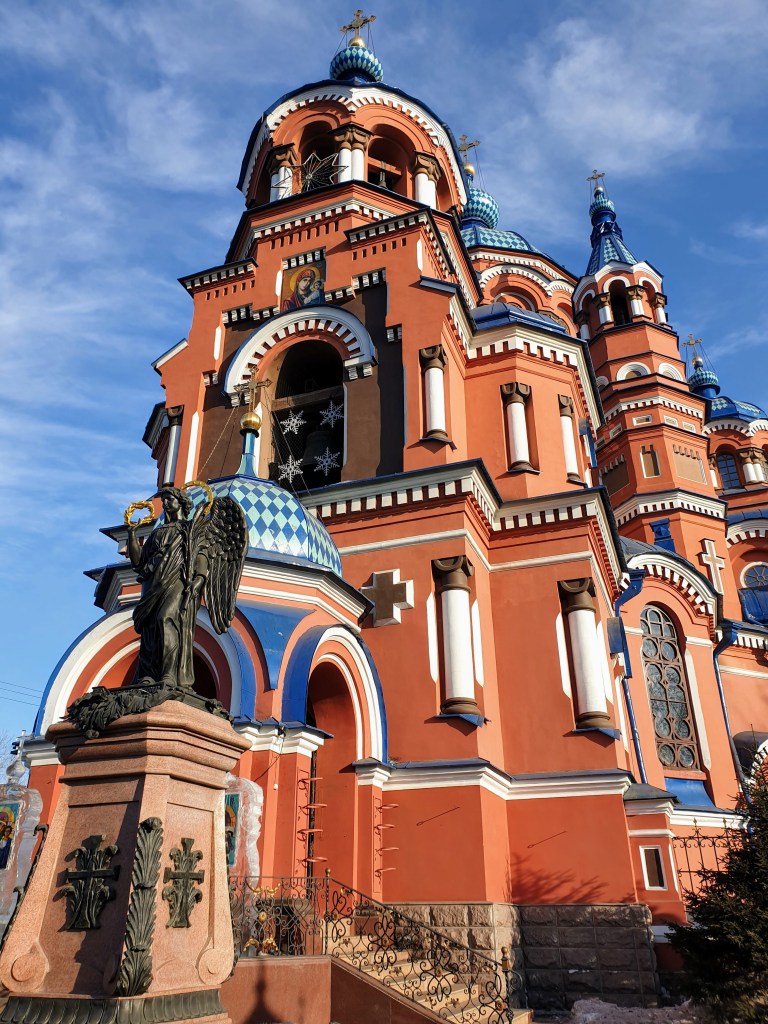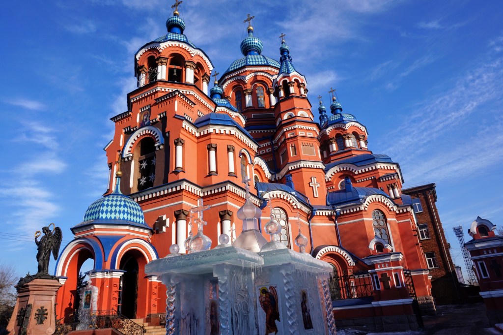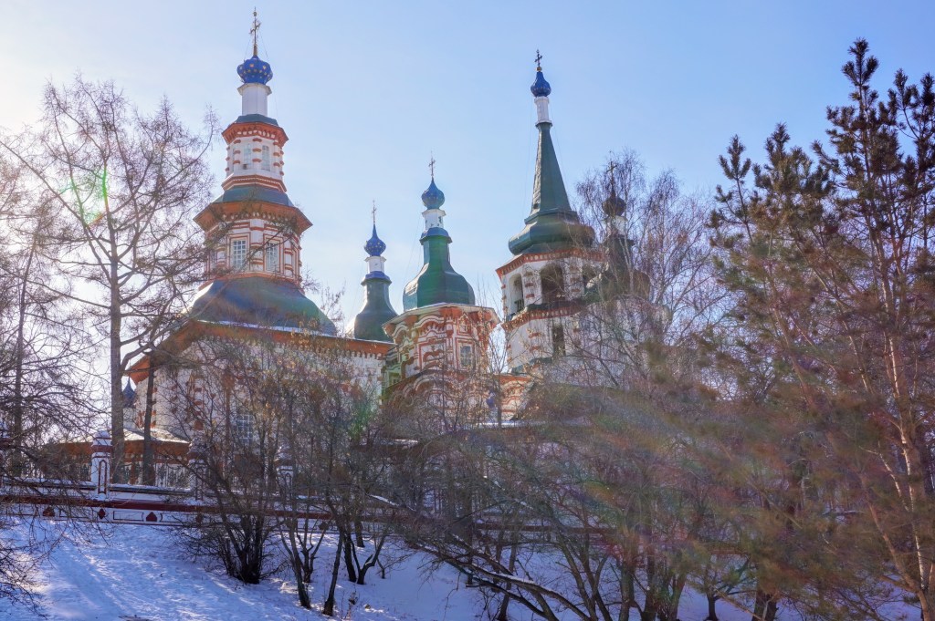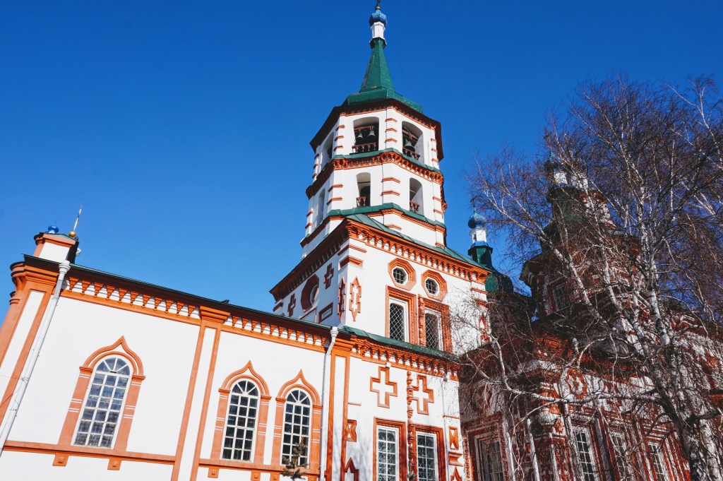 วิหารนี้เป็นวิหารของศาสนาคริสต์นิกายออร์โธดอกซ์และเป็นวิหารที่เป็นศูนย์รวมจิตใจของคนเมือง Irkutsk เลยทีเดียวเพราะว่าตอนสร้างวิหารเนี่ย มีการเรี่ยไรเงินสนับสนุนจากประชาชนในเมืองนี้ พ่อค้าในเมืองต่างๆ แม้กระทั่งนักโทษทางการเมืองที่ถูกขังไว้ที่นี่ก็ร่วมทุนในการสร้างด้วย ตรงยอดโดมจะเป็นรูปหัวหอมกลมๆ และมีโดมขนาดเล็กๆ ลดหลั่นกันลงมาอย่างสวยงาม ใช้สีสันตัดกันสวยมากกก เป็นเอกลักษณ์ของศิลปะแบบไบเซนไทน์ ตัววิหารนี้เห็นเด่นเป็นสง่าตั้งแต่เดินมาจากป้ายรถเมล์เลยครับ ยิ่งใกล้ก็ยิ่งสวยๆ และด้านในก็สวยงามไม่แพ้กัน ศิลปะแบบนี้จะเห็นได้จากวิหารหลายๆที่ในรัสเซียนะครับ เช่นวิหารเซนต์บาซิลในมอสโคว์ก็เป็นศิลปะแบบเดียวกัน แต่สีสันและขนาดก็ต่างกันไปครับ ตอนที่ผมไปก็มีน้ำแข็งแกะสลักเป็นรูปต่างๆ ด้านนอกตัววิหาร สวยงามมาก เหมาะกับการไปถ่ายรูป 5555